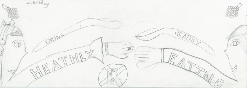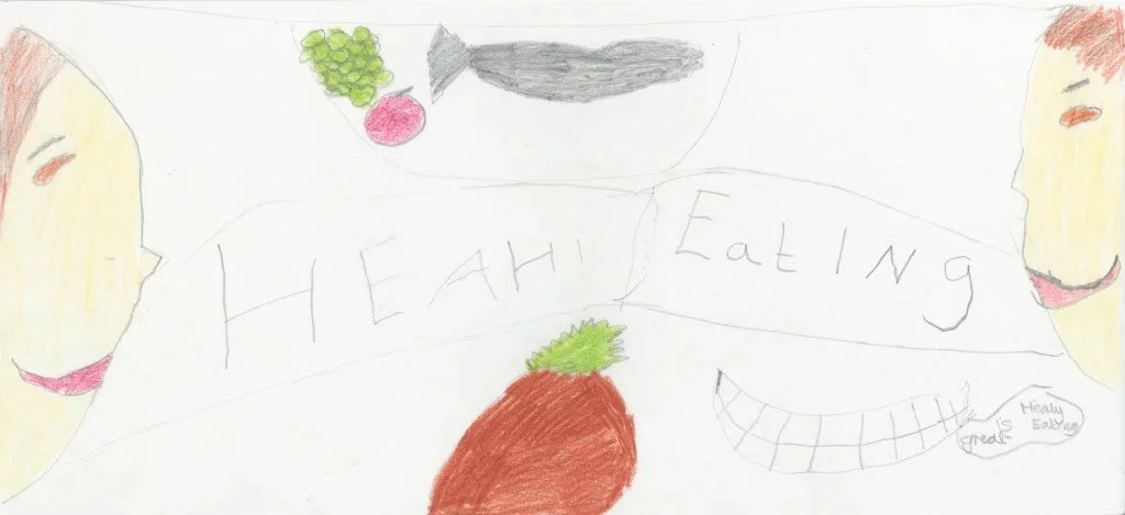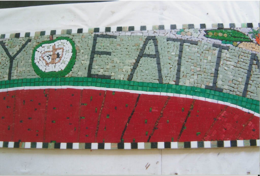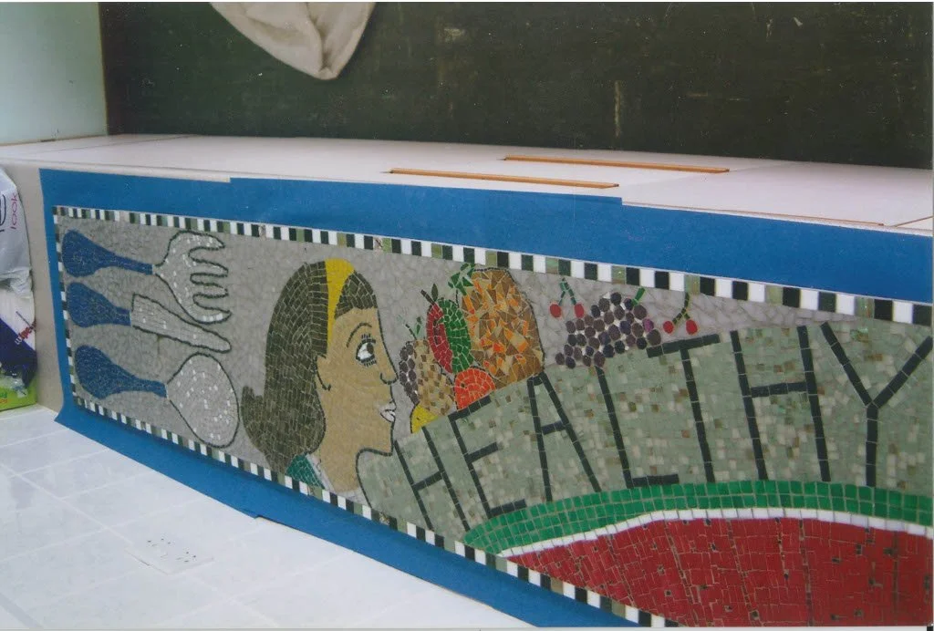 Sheredes Primary School “healthy eating” mosaic. Donna worked with years 5 & 6 in groups of 10 to creating this mosaic piece for the schools dinning room.