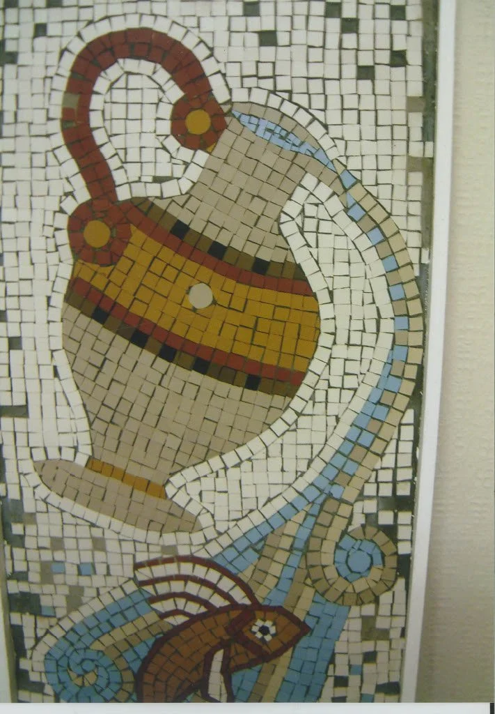 Mosaic of St Edmunds College School Crest. Donna worked with IB students to create this, teaching them how to create mosaic from start to finish.
